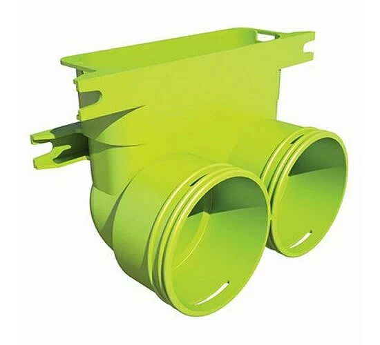 Übergangsadapter von 2 x Rundkanal RR 75 auf 1 x Flachkanal FK 140, 90 Grad-Umlenkung, 1 Stück/Paket.