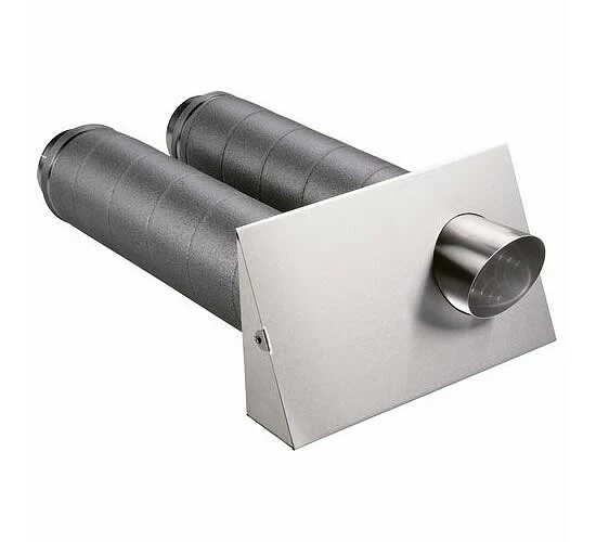 Außen- und Fortluftelement DN125, aus gebürstetem Edelstahl, für die horizontale Montage an der Wand.