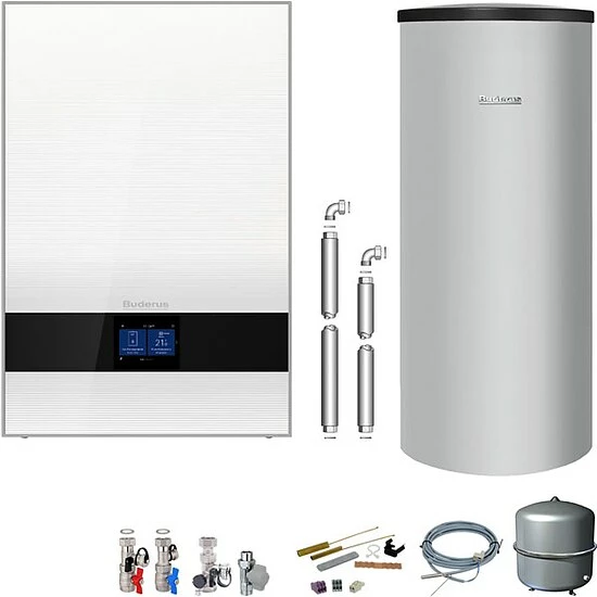 Buderus GB192i.2 Logaplus Gas-Brennwert Paket W50 mit Regelung BC400 in weiß und Warmwasserspeicher SU160 – 35 kW