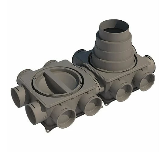 - Hauptleitungsanschluss lose im Lieferumfang, Montage an Ober- oder Unterseite möglich: DN125, DN150, DN160, DN180