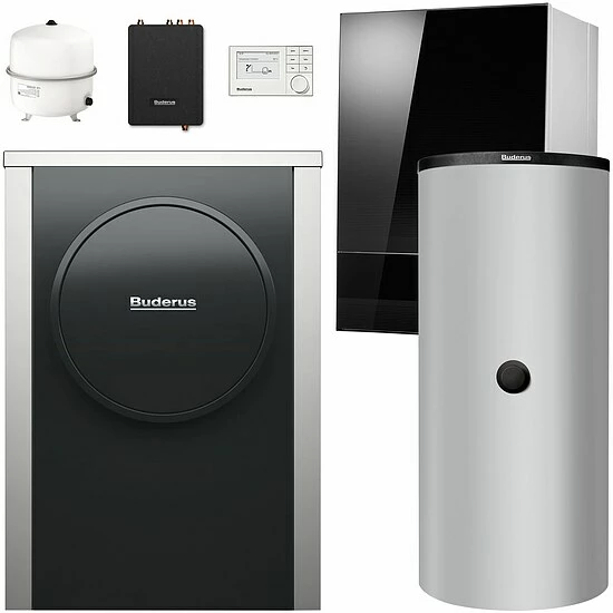 BUDERUS Wärmepumpenpaket Logaplus WLW E5 mit Luft-Wasser-Wärmepumpe Logatherm WLW196i.2-6 AR E S+ 7,3kW/7,4kW (Heiz-/Kühlleistung) reversibel, seperater Pufferspeicher Logalux PRZ500.6 S-B, Frischwasserstation Logalux FS20/2, Speichermontage-Set, Bedieneinheit SC300 und mit Systemzubehör, bestehend aus: