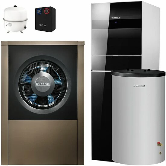 BUDERUS Logaplus Wärmepumpenpaket WLW196 iAR-9 mit Logatherm WLW196i-8 AR T190, reversible Luft-Wasser-Wärmepumpe incl. Tower mit integriertem Warmwasserspeicher und separatem Pufferspeicher P120.5 S-B für monoenergetischen Betrieb, 1 Heizkreis ungemischt, bestehend aus: