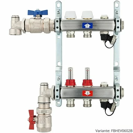 - Verteiler mit Anschlussset für senkrechte Montage: Verteiler vormontiert, 2x Kugelhahn 1″, 2x Winkelstück