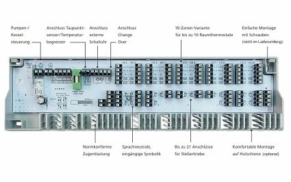 - Bis zu 21 übersichtlich angeordnete Anschlussklemmen zum Anschluss für max. 18 Stellantriebe