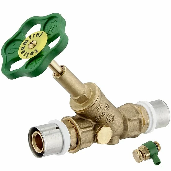 Schrägsitzventil mit 2 Pressanschlüssen für Alu-Mehrschicht-Verbundrohr 26 x 3,0 mm – DVGW zugelassen – mit 2 Stopfen 1/4″ + 1 Entleerventil 1/4″ (beiliegend)