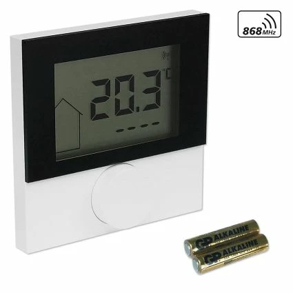 Raumbediengerät (Funksender) Alpha 2 – mit Display und schwarzer Designscheibe – Gehäuse reinweiß