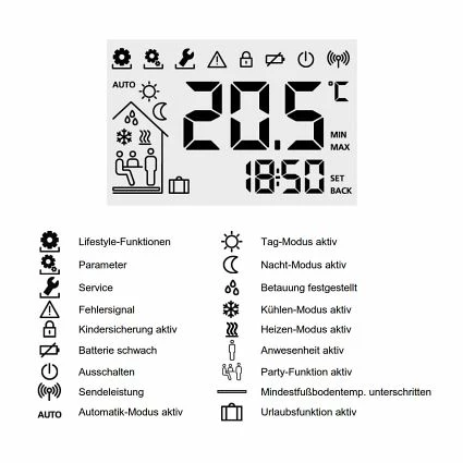 - Daueranzeige von Raumtemperatur, Systemzeit und Betriebszustand