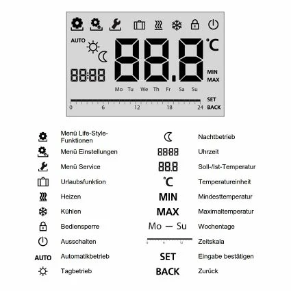 Die Einstellung der gewünschten Raumtemperatur und die Bedienung erfolgt über den Drehknopf mit Dreh-Drück-Mechanik und Softrastung. Über die übersichtliche und sprachneutrale Anzeige des hochwertigen Displays werden die Symbole immer deutlich angezeigt.