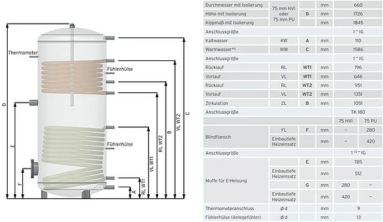- Anschlüsse: 2 Muffen für Elektroheizeinsatz mit 1 1/2 Zoll IG