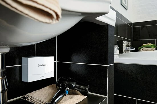 Klein, sparsam, effizient: Unser hydraulisch gesteuerter Durchlauferhitzer miniVED ist besonders platzsparend und lässt sich beispielsweise im Gästebad selbst unter dem kleinsten Waschbecken anbringen.