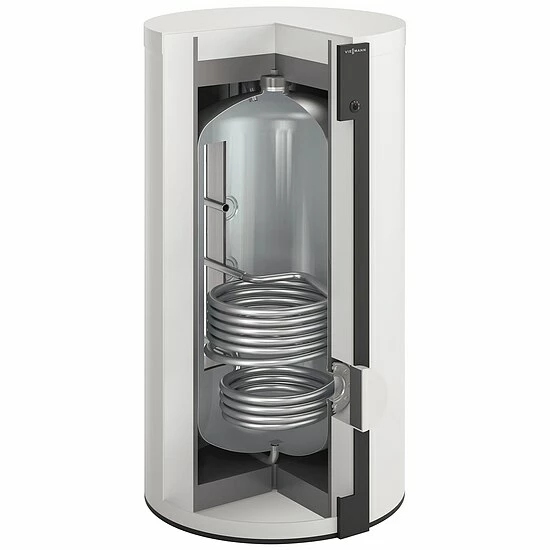 Senkrecht stehender Speicher-Wassererwärmer zur Trinkwassererwärmung mit zwei integrierten Wärmetauschern.