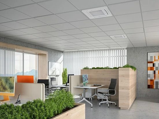 Grundgerät aus verzinktem Stahlblech mit eingebautem, motorisch gesteuertem Ventilator und effizientem, antibakteriell beschichteten Kupferwärmetauscher zur Kälte- und Wärmeabgabe an die Raumluft. Geeignet für die Installation in Euroraster-Zwischendecken. Luftgitter aus weißem Kunststoff, mit vierseitigem Luftauslass einschließlich passiven Filtern zur angenehmen Lufteinbringung. Die Ausblasrichtung kann durch den Nutzer oder automatisch eingestellt werden. Leiser Betrieb möglich dank Low noise Funktion. Mit elektronischer, raumgeführter Regelung, steuerbar per Fernbedienung. Zur Installation in der Zwischendecke.