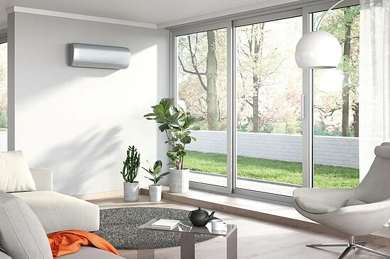 Möglichkeiten zur Einstellung von Betriebsarten (u. a. Heizen, Kühlen, Entfeuchten), Ventilatorgeschwindikeit, Soll-Raumtemperatur, Ausblasrichtung und Zeitprogrammen sowie zur Abfrage von Raumtemperatur, Feuchtigkeit und Luftqualität. Aktivierung von Komfortprogrammen (z. B. zugfreies Kühlen), Effizienzprogrammen (automatisches Abschalten bei Abwesenheit) und Hygienefunktionen (z. B. Selbstreinigungsprogramm). Mit automatischem Betrieb, Timerfunktion, Wartungs- und Störungsmeldung. Bedienung per Fernbedienung (im Lieferumfang) oder App auf dem Smartphone.