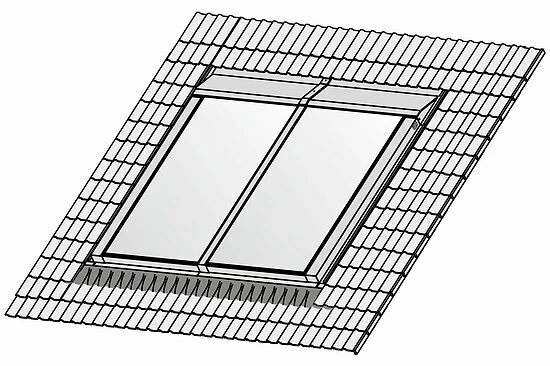 Dachanschlussrahmen zur architektonisch schönen Dachintegration der Kollektoren in die Falz-Ziegel-Eindeckung, mit beschichtetem Aluminiumblech in schwarzgrau. Für Dachneigungen von 20° bis 60°.