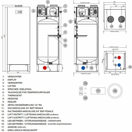 - Integriertes Elektroheizelement 2kW + Wärmepumpe 1,6 kW = 3,6 kW
